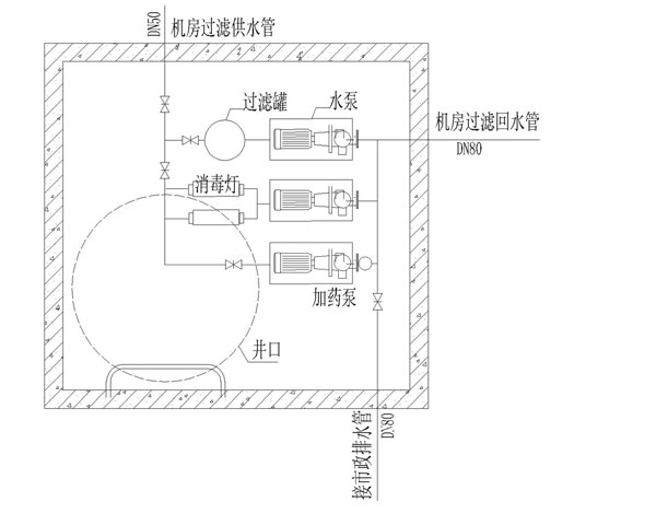 該方案泳池水循環一般采用順流式循環,回水口設在池底,在池壁水面下0.5-1.0米處均勻布置出水口。保證水流分布均勻,無短流、渦流及死水域,循環周期8-10H,循環次數3-2.4。泳池消毒采用紫外線消毒,循環水經過消毒后進入泳池。過濾采用高速濾罐,僅在需要時才開啟過濾泵,水質達標時不開啟。采用計量加藥泵投加混凝劑,定量加入管網后從給水口加入泳池。