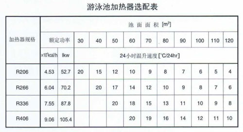 如果你的游泳池還沒有選配加熱器,請先確認你游泳池的規(guī)格并計算出池面面積,根據(jù)池面面積和你的溫升要求,查下表即可確定加熱器的規(guī)格。