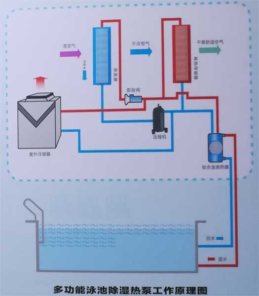 機組的風機從游泳館室內抽入溫暖潮濕的空氣,該空氣流經蒸發器,將熱能傳遞給冷夜態制冷劑,進行除濕降溫。這種能量交換可使空氣溫度降至其露點以下,在蒸發盤管上形成結露。凝結的水分流入設備的滴水盤中。液態制冷劑流過蒸發器膨脹之后就變為一種低溫低壓的氣態制冷劑。然后低溫氣制冷劑進入壓縮機,經壓縮低溫低壓的氣態制冷劑變為高溫高壓氣態。在進入壓縮機期間,制冷劑吸收了用于壓縮過程中的能量。這種高溫高壓氣態制冷劑流過空氣再加熱盤管(內機冷凝器)、池水冷凝器,或流過外機冷凝器,以實現對空氣再熱、池水恒溫及排出廢熱等功能。