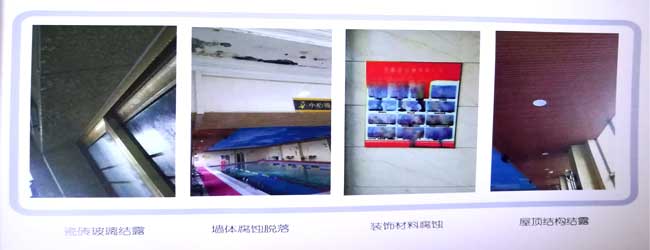 室內(nèi)泳池蒸發(fā)水汽中含有大量游離氯分子,吸附在建筑物上金屬結(jié)構(gòu)材料的表面,使金屬表面的保護(hù)膜破壞,在通過(guò)水的化學(xué)反應(yīng)導(dǎo)致金屬結(jié)構(gòu)腐蝕。