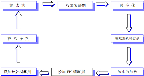 為了滿足人們對(duì)游泳池水質(zhì)越來越高的要求和人們對(duì)水質(zhì)在視覺、嗅覺上的愿望,結(jié)合我公司多年來在全國(guó)上百個(gè)工程實(shí)踐中所總結(jié)出的成功經(jīng)驗(yàn),我公司在游泳池水處理系統(tǒng)工藝流程中分為六大部分七大程序。六大部分分別為池水的循環(huán)、池水的凈化、池水加藥和水質(zhì)平衡、池水消毒、池水的加熱、水質(zhì)監(jiān)測(cè)和系統(tǒng)控制:七大程序分別為絮凝劑的投加、池水的凈化、池水的微絮凝機(jī)械過濾、池水的PH值調(diào)整、池水的長(zhǎng)效氯消毒、池水的除藻。